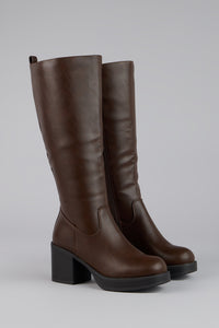 A little vintage, a little modern—these knee-high boots are the ultimate outfit maker. With a smooth faux leather finish, a sturdy block heel, and a platform sole perfect for elevating any outfit.