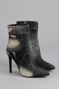 A playful spin on a staple—these denim stiletto booties bring just the right mix of flirty and fierce with a jean-like design perfect for making a bold statement.