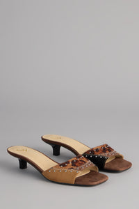 Step into your wild side. These slide heels feature a fierce patchwork animal-print strap with studded embellishments and a sleek kitten heel—mixing bold energy with effortless wearability for day or night looks.