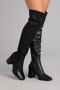 Serving sleek, chic, and straight-up confidence. These over-the-knee boots blend stretch knit with smooth faux leather for that perfect contrast of comfort and edge.