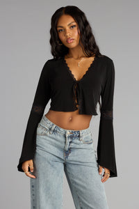 Soft, sultry, and a little mysterious. This lace-trim crop top brings the romance with its tie-front detail and dramatic bell sleeves—aka your new go-to for pairing with denim jeans for day or night plans.