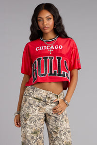 Not your average game-day tee. This off-the-shoulder Bulls top brings major cool-girl energy with a fitted silhouette that’s equal parts sporty and sultry. Style it with cargos or a mini skirt for that courtside-chic vibe.