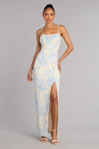 Softly sculpted and quietly captivating, the Brandy beaded gown is designed to glide with you through every elevated occasion. A floral pattern adds romantic texture to the form-hugging column silhouette, while the high front slit delivers a refined hint of allure made for unforgettable entrances.