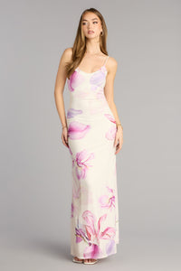 This floral mesh maxi dress features a plunging cowl halter neckline and an open back that feels equal parts romantic and intentional—made for weddings, date nights, and birthday cocktails.