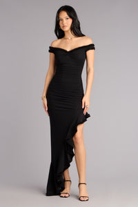 Designed for moments that call for elegance with impact, the Mandy mesh column gown moves with quiet drama from every angle. The ruffled off-the-shoulder sweetheart neckline and sculpting ruching create a polished silhouette made to turn heads without trying too hard.