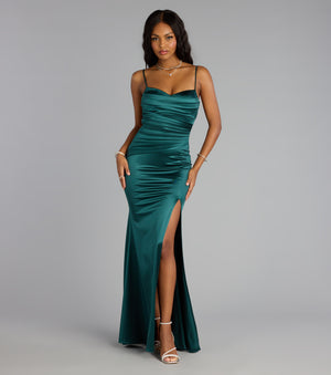 Crafted to glow from every angle, the Gwyneth metallic mermaid dress sculpts with a ruched sweetheart neckline and dramatic floor-sweeping silhouette. A sleek back cutout with bar strap detail adds just the right edge, along with the high-shine finish—perfect for black-tie nights that call for all-out glamour.