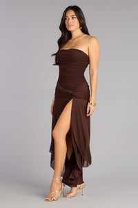 A strapless maxi dress that knows how to flirt without trying. The ruched fit sculpts every curve, while the ultra-high slit and ruffled silhouette bring just the right dose of drama.