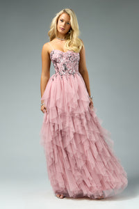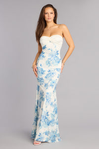 Romantic movement meets modern elegance in the Jacie floral ruffle column dress designed for unforgettable entrances. Soft layers of ruffles cascade along the high side slit, creating fluid motion with every step, while the strapless neckline keeps the look sleek and refined. It’s the kind of dress that feels effortless yet completely event-ready.