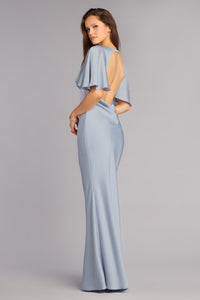 The Viviana is the kind of satin mermaid dress that feels made for a graceful entrance. Flutter short sleeves frame the neckline, while an open back with a soft drape accent adds an unexpected moment of drama as you move.