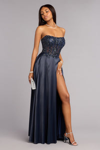 For evenings that call for something timeless with a little intrigue, the Magnolia gown delivers in luminous satin with graceful movement. Designed with a strapless applique bodice, lace-up back, and flowing A-line skirt with a front slit, it strikes the perfect balance between classic elegance and modern allure.