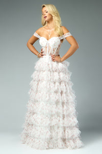 Whimsical yet undeniably polished, the Brienne tulle ball gown feels like a modern fairytale brought to life. Layers of ruffled tulle, sheer corset bodice, and off-the-shoulder neckline sculpt and frame with a soft, romantic structure.