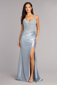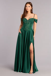 Some entrances feel effortless, others feel unforgettable — the Ava gown does both. Crafted in satin with an embellished structured corset bodice and flexible boning, the A-line silhouette flows from a sculpted waist into a high front slit, while the cold shoulder neckline with satin pleated cuffs and lace-up back adds a romantic finish.