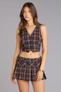 Prep, but make it playful. This plaid cropped vest top features a V-neckline and button-down front. Perfect for pairing with the matching mini skort.