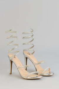 When your shoes are the outfit, these metallic stiletto heels flaunt a sleek almond toe and sparkling rhinestone spiral straps that wind up the leg for that head-turning, “don’t wait up” kind of entrance.