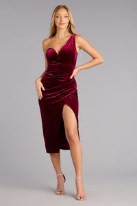 Designed to flatter from every angle, The Leila formal dress is equal parts sultry and refined. Cut from plush velvet, this form-hugging silhouette features a one-shoulder sweetheart neckline and a wrap front slit that moves beautifully with you through every entrance and exit.