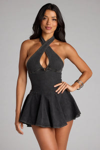 Flirty, soft, and ready for the spotlight. This velvet halter mini dress features a ruched bodice and tiered skater skirt that moves effortlessly with you—made for date nights, cocktail parties, and every glam moment in between.