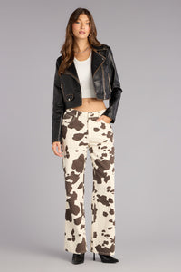 Call it denim with a wild streak. These cow print jeans bring a bold twist to your everyday fit with their flattering straight-leg fit and playful pattern—perfect for styling up with a corset and leather jacket, or a cozy knit sweater.