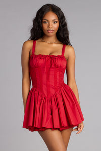Flirty with a vintage twist. This poplin corset mini dress features a sweetheart neckline with bust ties, lace-up back detailing, and a drop-waist skater skirt that twirls like a dream at parties, date nights, and any dressy occasion!