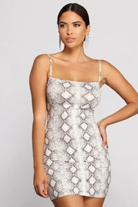 You'll be a total stylish vixen in this trendy snake print mini dress! It features a flattering square neckline and a curve-hugging fit. Keep it chic with some dazzling duster earrings and heels for a night out.