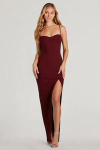 Easy to impress and so chic, the Fran formal crepe column dress exudes sophistication. It features a classy sweetheart neckline with a pleated bust, spaghetti straps, and a flattering fitted column silhouette with a high front slit and long-length hem.