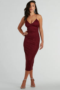 Lynn Strappy Back Glitter Midi Formal Dress Lynn Strappy Back Glitter Midi Formal DressSpecial Occasion Captivating glitter defines the Lynn midi formal dress with sexy details you want to show off at banquets or dressy celebrations! Crafted from a glitter crepe fabric, she dazzles from head to toe. Her flattering V-neckline and padded bra cups offer comfort and highlight your bust while the sleek bungee spaghetti straps and strappy back add a touch of sophistication to the bodycon midi-length silhouette. Complete the look in elegant stiletto heels. Fit & Features - Glitter crepe woven fabric lined with stretchy knit