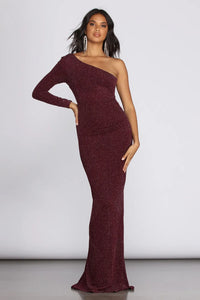 Have a night to remember in our beautiful Brigitte evening gown. She features a slanted neckline with one long sleeve. Her hem is floor length, and she has a slight low back with a hidden zipper. She is composed of a metallic lurex that offers minimal stretch with a form fit.