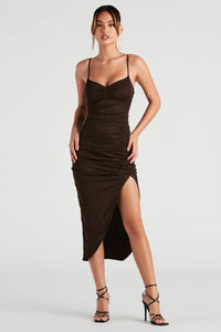 Bring the dazzle with a glitter dress that shimmers from all your best angles. The dress features a sleeveless cowl neckline, spaghetti straps, and a midi-length silhouette. The dress is composed of a glitter velvet fabric that offers a form hugging fit with a moderate stretch. Complete look with glitter heels.