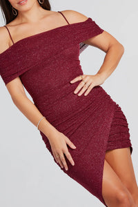 A glitter mini dress to dazzle the night away! This showstopping mini-length dress features an off-the-shoulder neckline, spaghetti straps, a front foldover design, and ruched side seams for a bodycon silhouette and a trendy asymmetrical hem on glitter mesh fabric. Complete the look in platform heels for a night on the town!