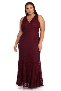 Special OccasionShine on through the evening in our enchanting Nicki burgundy dress! She showcases curves while featuring a sleeveless bodice, a V neckline with a lace trim, supportive padded cups and princess seams. Her back features an eye catching keyhole with a fish hook clasp closure and complemented with a lower back zipper closure. Her relaxed fit bodice leads to a flowing mermaid silhouette to bring the drama. She is composed of a burgundy hued lined scalloped lace fabric adorned with gleaming glitter details. Dress offers a relaxed fit with a moderate stretch.