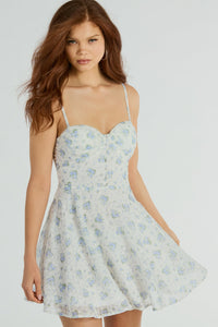 This breezy chic floral chiffon skater dress is perfect for your summer parties! The airy sheer embroidered chiffon fabric is detailed with a dainty floral print and includes a stretchy full-length knit lining. The short dress features a sleeveless sweetheart neckline, a bustier-style bodice with a padded bust and structured underwire, and ruched cups. The adjustable spaghetti straps lead to a partially smocked back design for added stretch with a secure back zipper closure. The front faux buttons lead to a high waist seam flowing out to a short skater skirt with a flirty fit and flare A-line silhouette. Complete your look with strappy sandals.