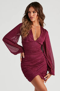 Light up the night in this glitzy glitter short dress for your next dressy occasion! The dress features sheer peasant sleeves, a V-neckline, a faux wrap skirt, and side-ruched seams to accentuate your curves along the short, bodycon silhouette. Complete the look with an envelope clutch.
