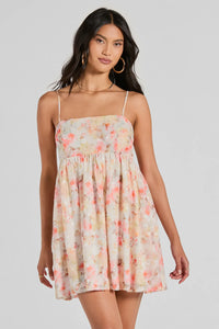 Uncover this dreamy and whimsical garden floral babydoll dress for dressy soirees! Its square neckline, adjustable spaghetti straps, and hidden side pockets make it perfect for any occasion. The babydoll silhouette and short-length hem on a rose floral printed chiffon fabric with a knit lining add a touch of charm. Complete the look with earrings and platform block heels.