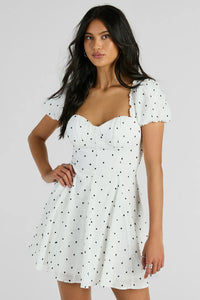 Envoke a charmed and cute style in this polka dot skater dress perfect for showers or graduates! Show off your curves with the sweetheart neckline and skater silhouette, while adding a touch of cuteness with the short puff sleeves. The tie-back adds a flirty detail and the short-length hem is perfect styling with trendy sneakers for a casual vibe.
