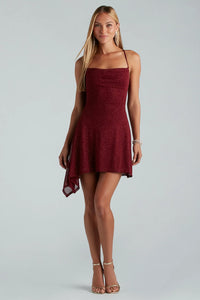 Go from dusk til' dawn in this glitter party dress! Perfect for dressy events, this sizzling style features a cowl neckline, spaghetti straps, a crisscross back, and a show-stopping a-line silhouette. Top it off with the sparkling glitter mesh fabric, and you've got a totally stunning look! Complete the look with earrings and heels.