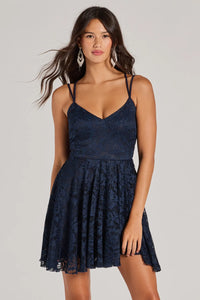 The perfect lace skater dress that'll take your day somewhere magical! Perfect for rehearsal dinners, birthdays, or graduation. This dress features a flattering V-neckline, spaghetti straps, and a playful cross-back design. Its skater silhouette and surplice ruffled short-length hem will keep you twirling all day! Complete the look in strappy block heels.
