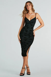 Strike a wow-worthy impression in this floral mesh velvet midi dress for an effortlessly romantic look! Boasting a surplice V-neckline, adjustable spaghetti straps, and side ruched seams, this bodycon midi dress is sure to please at parties. Flocked floral velvet adds a luxurious touch to the midi-length hem with a side slit for a graceful finish. Complete the look in strappy block heels.