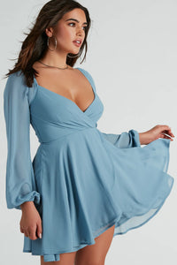 This dreamy long sleeve chiffon skater dress has a flowy silhouette to give you that effortlessly ethereal look! The short dress is crafted with an airy sheer chiffon fabric for a lightweight feel, and includes a partial knit lining for coverage. The bodice is shaped with a V-neckline with a chic pleated surplice design, and the sheer long balloon sleeves have cinched hems. The back features a partially smocked design for added stretch. The high waist seam flows out to a short skater skirt with a fit and flare silhouette and a faux wrap-front design. Complete your outfit with block heels for a bridal shower or birthday party!