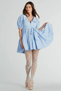 Sweet and stylish, this striped woven skater dress is spring-time perfection! The lightweight woven fabric features a chic vertical striped pattern for a polished look. The short dress has a collared V-neckline for that touch of sophistication, leading to a partial button-down front. The short puff sleeves add an adorable detail. The high waist is accented with a tie-back design, and flows out to a fit-and-flare skater silhouette. Pair this short dress with wedges for weekend brunch!