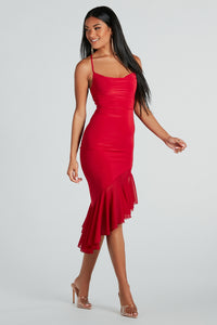 Enjoy the timeless allure of this sleeveless midi dress showcasing a fun and fabulous flair that'll inspire you to get dolled up! The midi-length dress features a sultry cowl neckline, spaghetti straps that shape the open strappy back detail, a curve-hugging silhouette, and an asymmetrical mesh ruffled hem. Complete the look in block heels for a date night!