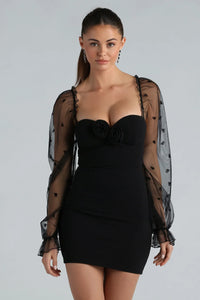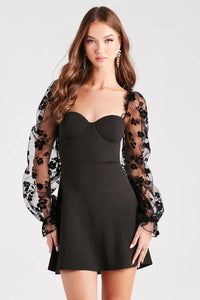 Feel simply lovely in the crepe mini dress to add a touch of romance to your wardrobe! It features sheer mesh peasant long sleeves with a rose velvet pattern and elastic cuffs, a sweetheart neckline, a built-in padded bust with underwire and rosette appliques, plus a flattering bodycon silhouette and mini-length hem. Complete the look in platform heels and a clutch for a dinner party or dressy date night!