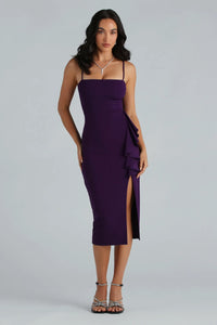 Turn heads in this stunning midi dress! Crafted with crepe fabric, the bodycon silhouette features a flattering square neckline, spaghetti straps, and playful ruffle trim atop a front slit and midi-length hem. Complete the look in stiletto heels for a dressy party or date!