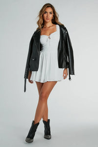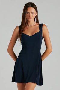 Let everyone admire your beauty in this woven skater dress! The sassy sweet dress features a sleeveless sweetheart neckline and shoulder straps with delicate sheer lace trim, a front bust tie, and a corset-seam bodice leading to the flowy short-length hem. The airy woven fabric includes a stretchy knit lining. Complete the look with heeled sandals.