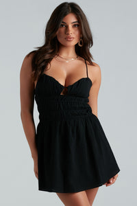 Stroll on by making everyone stop and stare at you in this flirty skater dress! It features a sleeveless V-neckline, adjustable spaghetti straps, a cutout bust accent, a stretchy smocked bodice, and a flattering skater short-length hem. Complete the look in statement sandals for a brunch or day date!