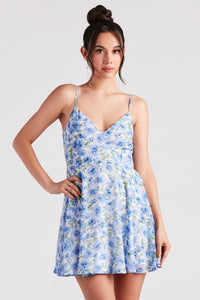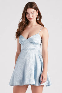 Sleek with an adorable flirty flair, the Kara formal floral satin skater short dress is the picture-perfect option for parties! She features a sleeveless V-neckline, adjustable spaghetti straps for customizable wear, a fitted high waist, a short skater skirt, and a fit and flare silhouette. The smooth satin woven fabric features an all-over floral pattern for the prettiest look. Style this dress with platform heels.