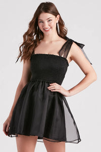 This skater dress was made for a dinner and dessert date night! It features a sleeveless square neck, organza tie-straps, a stretchy smocked bodice, and a fit-and-flare short hem with an organza overlay. Complete the look in rhinestone lace-up heels and a clutch.