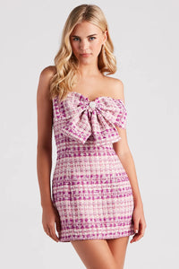 Poised and polished, this tweed mini dress is a prize-worthy option for afternoon tea parties, a dressy brunch, or meeting the parents! Features a strapless neckline with non-slip grip lining, a statement bow on the front with a lovely faux pearl centerpiece, and a curve-hugging silhouette. The dress is composed of a tweed plaid material with a smooth woven lining. Style with chic stiletto pumps and a mini tote bag.