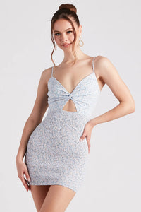 Give off those effortless weekend vibes in this adorable floral mini dress! It features a V-neckline with a twist-front design, a front keyhole cutout under the bust, adjustable spaghetti straps, a smocked design down the back and body of the dress, a mini-length hem with a form-hugging silhouette, and a ditsy floral print pattern. The woven fabric offers a moderate stretch. Style with espadrille sandals.