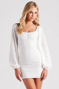 A modern take on a romantic silhouette! This eyelet lace mini dress is cute for bridal showers or casual day dates. It features long peasant sleeves, a square neck, a ruched bust, and a form-hugging silhouette. Complete the look in chic lucite block heels.