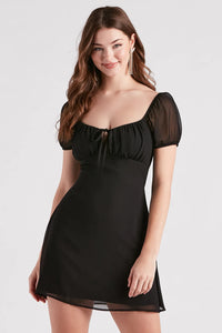 Flirt and twirl in this sassy little chiffon dress perfect for date nights or parties! It features adorable sheer puff short sleeves, a ruched square neck with a bust tie and keyhole, an open back with tie closure, and a flowy short skater silhouette. Complete the look in platform block heels.