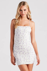 Effortlessly cute with subtle detail, what's not to love about this ditsy floral mini dress? It features a sleeveless V-neckline with a ruched bust seam, spaghetti straps, and a bodycon silhouette. Complete the look in trendy flat sandals for a brunch.